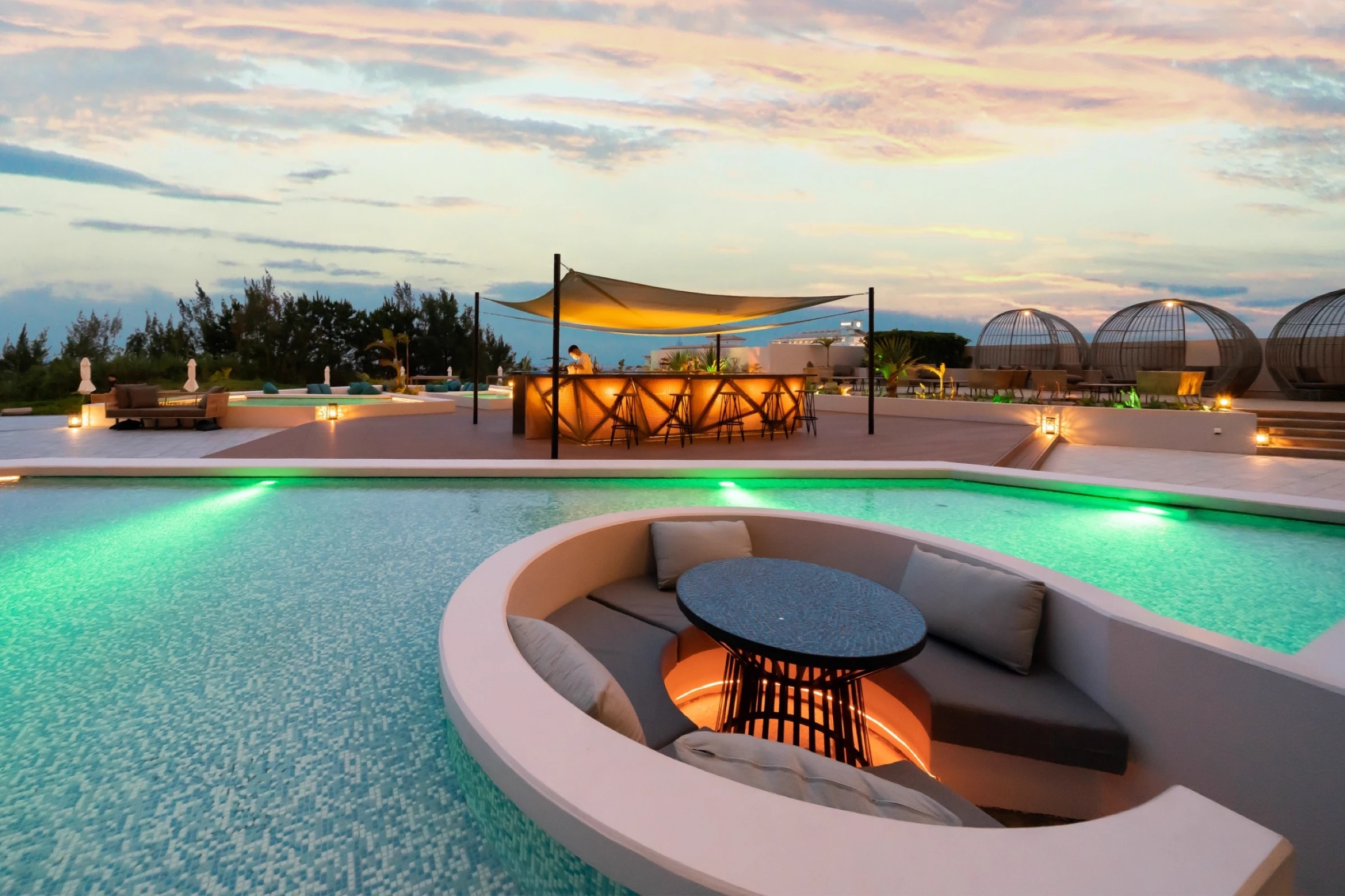 プールサイドでドリンクを愉しみ、夕暮れ時には